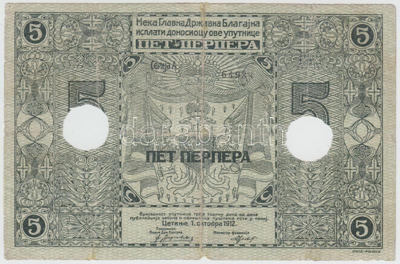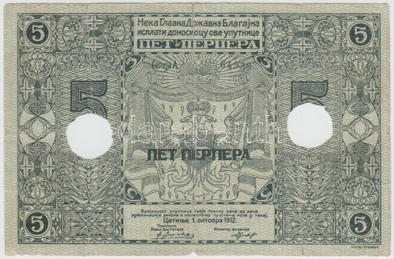 Montenegro 1912. 5 P... https://www.darabanth.com/de/212-Fernauktion/212.0/Numismatik/Weltweit-Banknoten~200023/Montenegro-1912-5P-hivatalos-lyukasztassal-TIII-3Cbr3EMontenegro-1912-5-Perper-with-official-canc~II877226