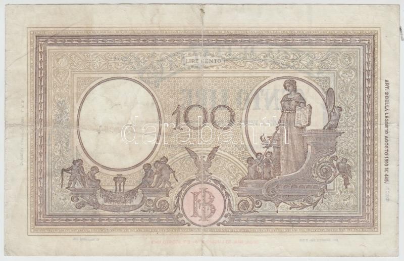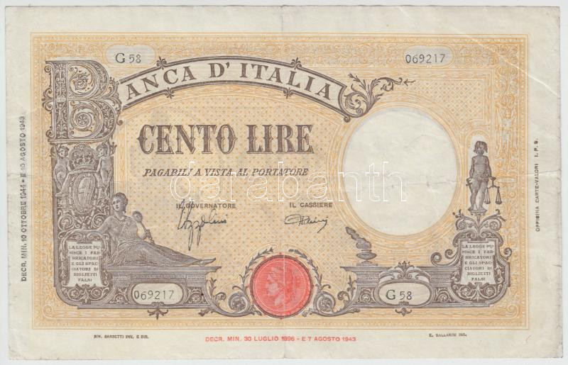 Italy 1943-1944. 100 Lire C:F https://www.darabanth.com/de/212-Fernauktion/212.0/Numismatik/Weltweit-Banknoten~200023/Olaszorszag-1943-1944-100L-TIII-3Cbr3EItaly-1943-1944-100-Lire-CF~II876927
