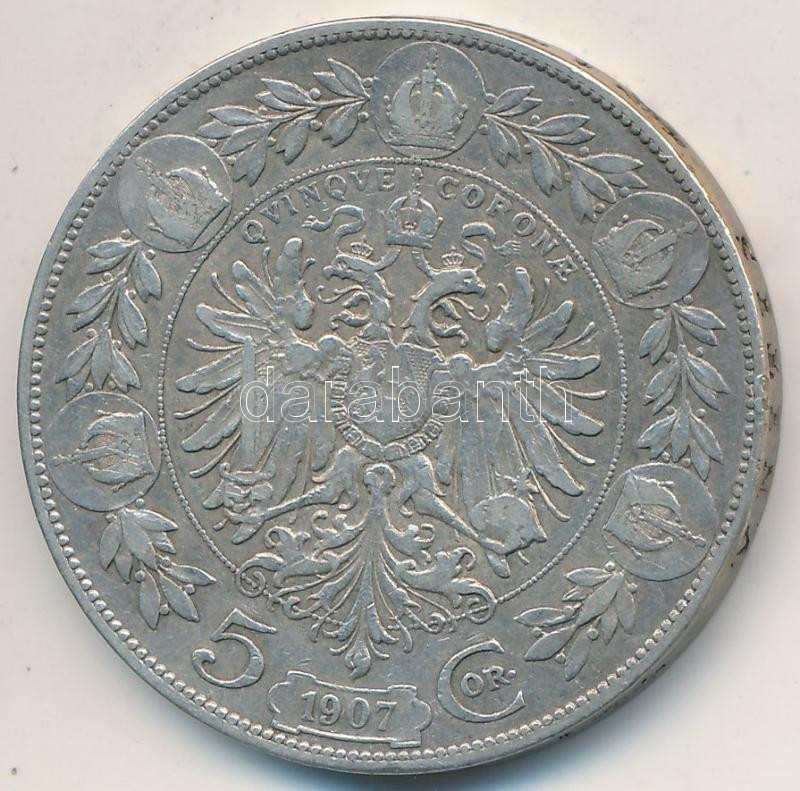 Austria 1907. 5 Corona Ag C:F https://www.darabanth.com/de/212-Fernauktion/212.0/Numismatik/Weltweit-Munzen~200024/Ausztria-1907-5K-Ag-T3-3Cbr3EAustria-1907-5-Corona-Ag-CF~II879117