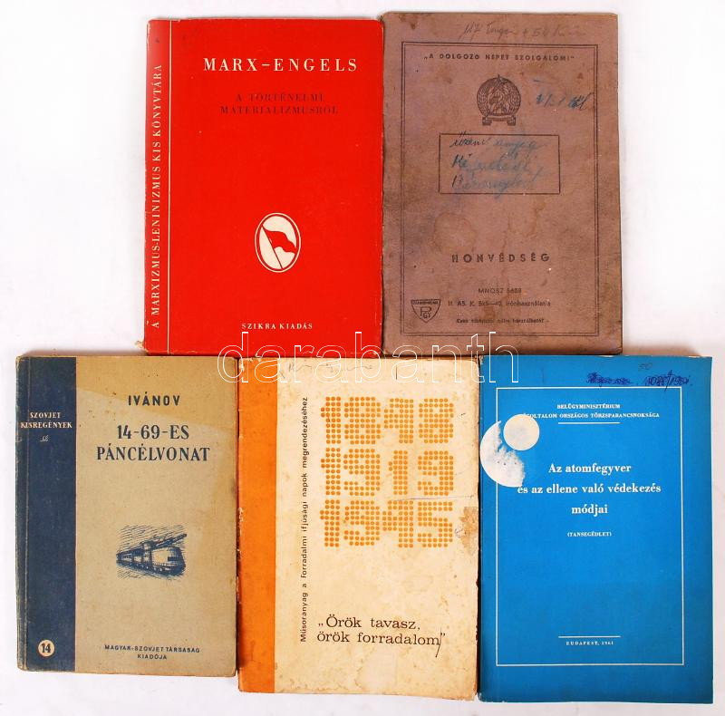 5 db szocreál irodalom-Ivánov: 14-69-es páncélvonat; Az atomfegyver és az ellene való védekezés módjai; Marx-Engels: A történelmi materializmus; "Örök tavasz, örök forradalom". Papírkötés,kopottas állapotban.