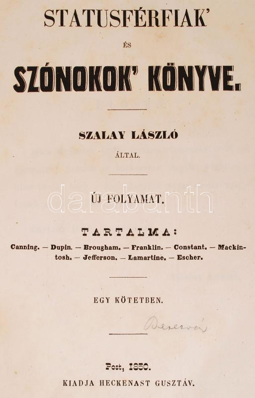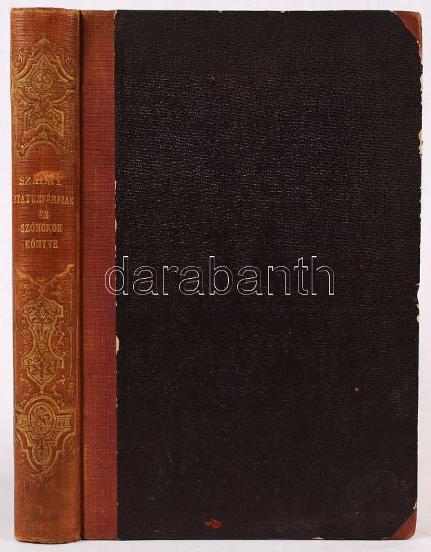 Szalay László: Statusférfiak' és szónokok' könyve. Egy kötetben. Pest, 1850, Heckenast Gusztáv. Aranyozott gerincű félvászon kötés, gerincnél enyhén sérült, festett lapszélek, egy lapon kis szakadás, több hajtott lap, kissé kopottas állapotban.