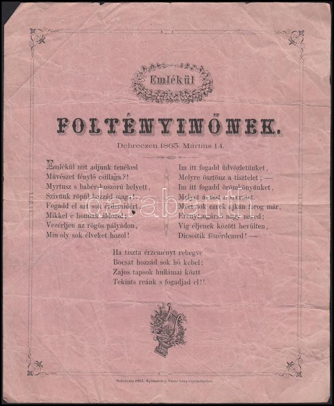 1865 Foltényi Vilmosné; Szabó Amália. (1830-1901) debreceni színésznőn... https://www.darabanth.com/de/213-Fernauktion/213.0/Andere-Sammelgebiete/Drucksachen~12/1865-Foltenyi-Vilmosne-Szabo-Amalia-1830-1901-debreceni-szinesznonek-irt-emlekvers~II869418