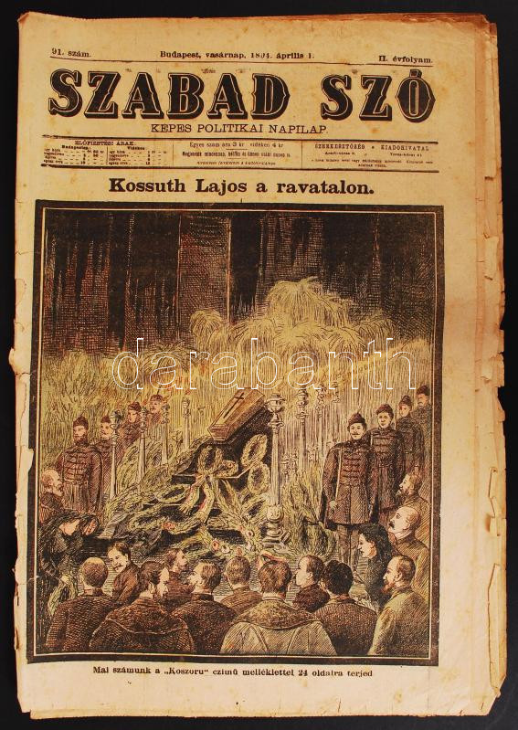 1894 Bp., Szabad Szó, Képes Politikai Napilap II. évfolyam 91. szám, címlapon Kossuth Lajos ravatalát megjelenítő színes rajzzal, Kossuth temetésével foglalkozó cikkekkel, 8p