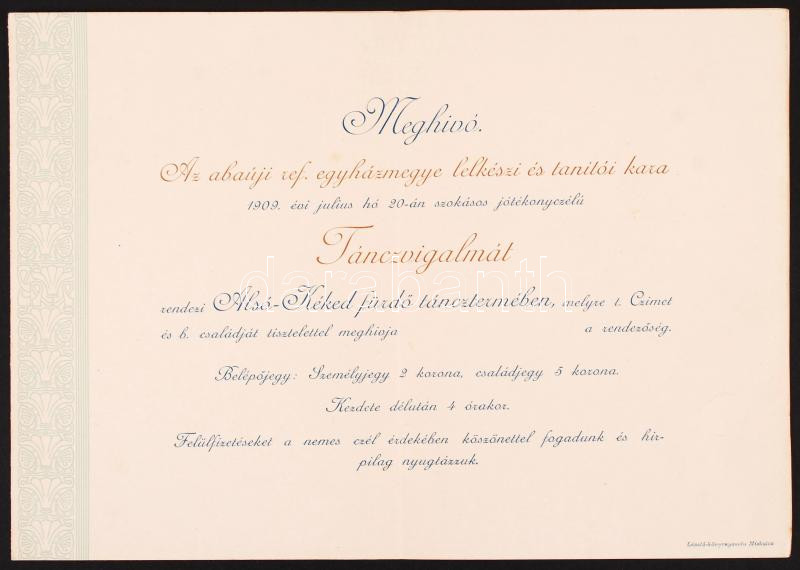 Beschreibung: 1909 Meghívó Alsó Kéked fürdő táncvigalomra