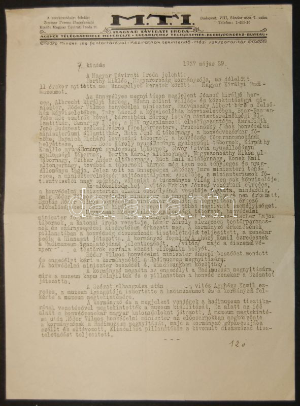 1937 május 29. MTI jelentés a Magyar Királyi Hadimúzeum megnyitásáról ... https://www.darabanth.com/de/213-Fernauktion/213.0/Andere-Sammelgebiete/Drucksachen~12/1937-majus-29-MTI-jelentes-a-Magyar-Kiralyi-Hadimuzeum-megnyitasarol-Horthy-Miklos-altal~II870781