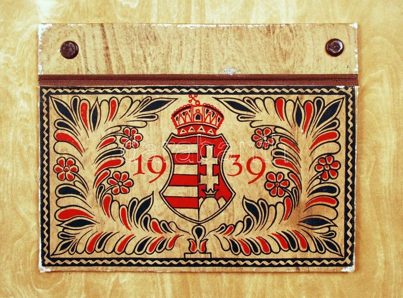 Beschreibung: 1939 Bp., M. Kir. Külkereskedelmi Hivatal által kiadott asztali naptár, hátulján címeres táblácskával