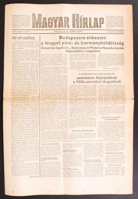 1968 A Magyar Hírlap 1., induló száma https://www.darabanth.com/de/213-Fernauktion/213.0/Andere-Sammelgebiete/Drucksachen~12/1968-A-Magyar-Hirlap-1-indulo-szama~II874394