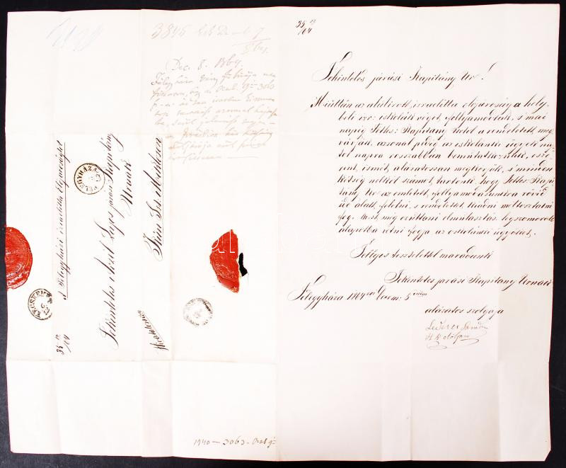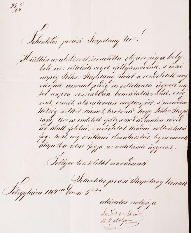 1864 Lechner Sándor kiskunfélegyházi izraelita hitközségi elöljáró aláírt levele a Kunszentmiklósi járási kapitánynak iskolai ügyben / 1863 Autograph signed letter of the Kiskunfélegyháza jewish community