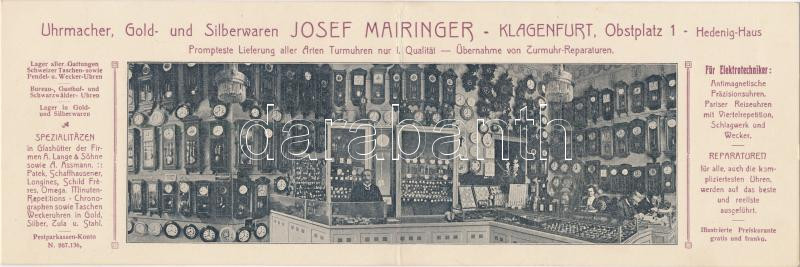 Beschreibung: Klagenfurt, Josef Mairinger's Uhrmacher, Gold- und Silberwaren-Handlung, Obstplatz 1, Hedenig-Haus / watchmaker's shop, folding card