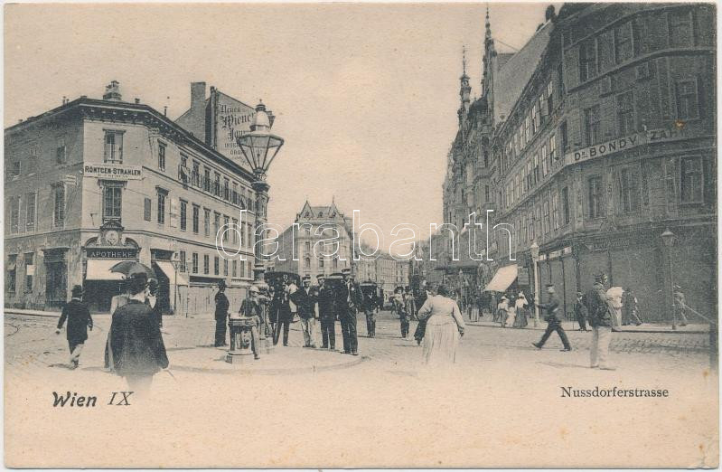 Beschreibung: Vienna, Wien IX. Alsergrund, Nussdorferstrasse, Röntgen Strahlen, Dr. Bondy Zahnartzt, Apotheke / street, dentistry, pharmacy, B.K.W.I. No. 59. (EK)