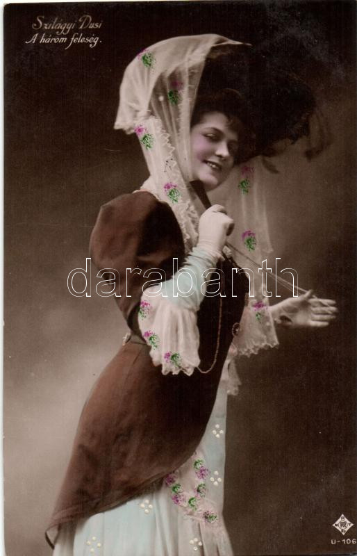 Szilágyi Dusi, A három feleség https://www.darabanth.com/de/213-Fernauktion/213.0/Ansichtskarten/Schauspielerin~600420/Szilagyi-Dusi-A-harom-feleseg~II866658