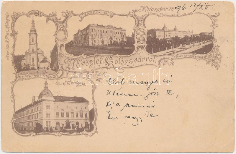 1896 (!) Kolozsvár, Erdő és pénzügyigazgatósági paloták, EMKE palota, Evangélikus református Theologia, Szent Ferenciek temploma, kiadja Kováts P. fia / palaces, theological institute, church Art Nouveau (fa)