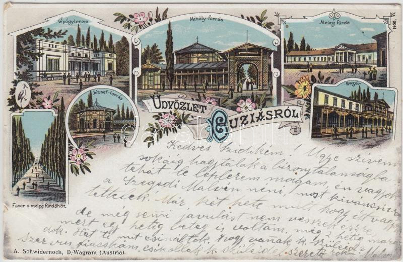 Beschreibung: Buziás, József és Mihály forrás, Gyógyterem, Meleg fürdő, bazár / spring, spa, bazaar Art Nouveau litho (kis szakadás / small tear)