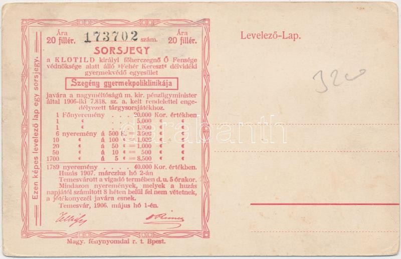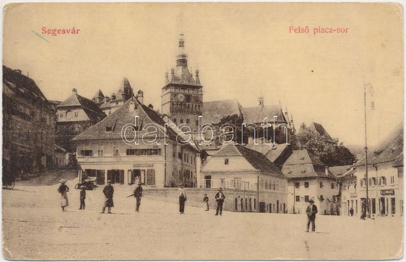 Segesvár, Felső piac sor, H. Cirscht és W. Leinhardt üzlete, hátoldalon sorsjegy Szegény gyermekpoliklinika javára / market place, shops, charity lottery ticket on the backside (EK)