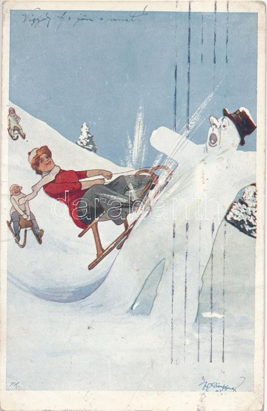 Sleighing, humour B.K.W.I. 2856-3. s: Schönpflug https://www.darabanth.com/de/213-Fernauktion/213.0/Ansichtskarten/Sport~600416/Sleighing-humour-BKWI-2856-3-s-Schonpflug~II891215