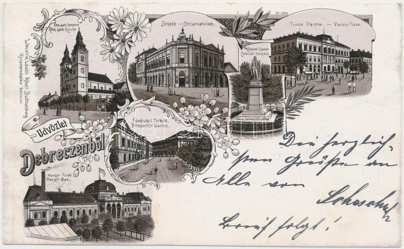 1897 Debrecen, Római katolikus templom, Zenede, Csokonai szobor, Tisza Palota, Füvészkert Torkolat, Margit fürdő, litho, floral, Art Nouveau (fa)