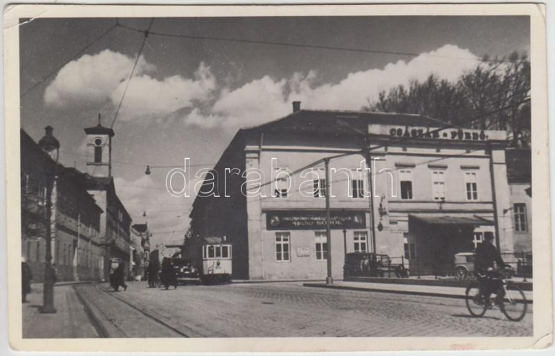 Beschreibung: Budapest II. Császár fürdő és szálló, főbejárat, vendéglő Dreher sörökkel, villamos (ragasztónyom / gluemark)