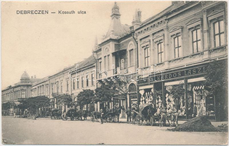 Debrecen, Kossuth utca, Kardos László üzlete https://www.darabanth.com/de/213-Fernauktion/213.0/Ansichtskarten/Ungarn~400006/Debrecen-Kossuth-utca-Kardos-Laszlo-uzlete~II890567