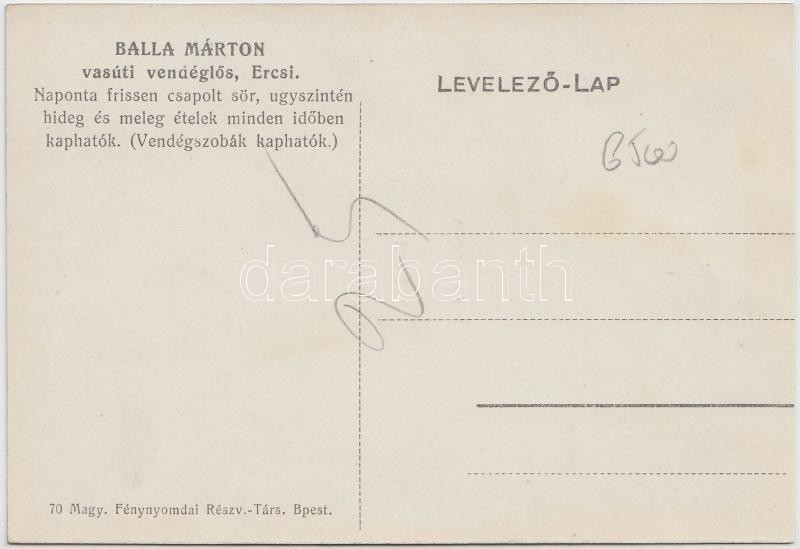 Beschreibung: Ercsi, cukorgyár, vasútállomás, hátoldalon Balla Márton vasúti vendéglős reklám