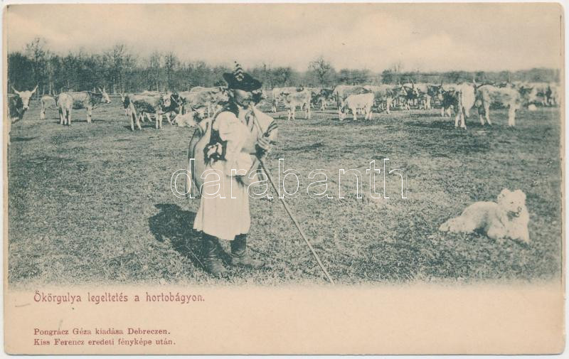 Hortobágy, ökörgulya legeltetés, Pongrácz Géza kiadása https://www.darabanth.com/de/213-Fernauktion/213.0/Ansichtskarten/Ungarn~400006/Hortobagy-okorgulya-legeltetes-Pongracz-Geza-kiadasa~II890606