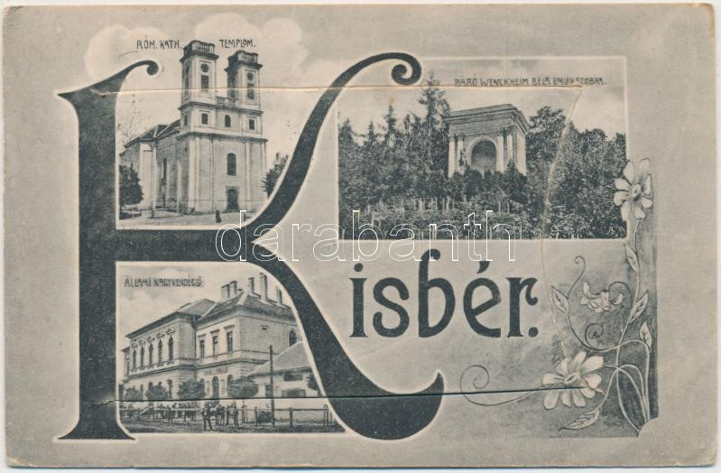 Beschreibung: Kisbér, Állami nagyvendéglő, Báró Wenckheim Béla emlékszobra, zsinagóga, Kozma törzsmén floral panoramacard