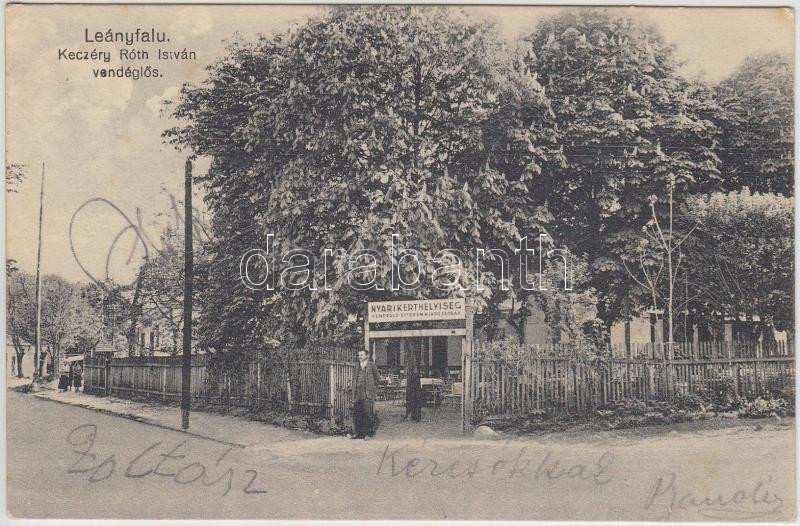 Leányfalu, Keczéry Róth István vendéglős, Nyári kerthelyiség https://www.darabanth.com/de/213-Fernauktion/213.0/Ansichtskarten/Ungarn~400006/Leanyfalu-Keczery-Roth-Istvan-vendeglos-Nyari-kerthelyiseg~II890423