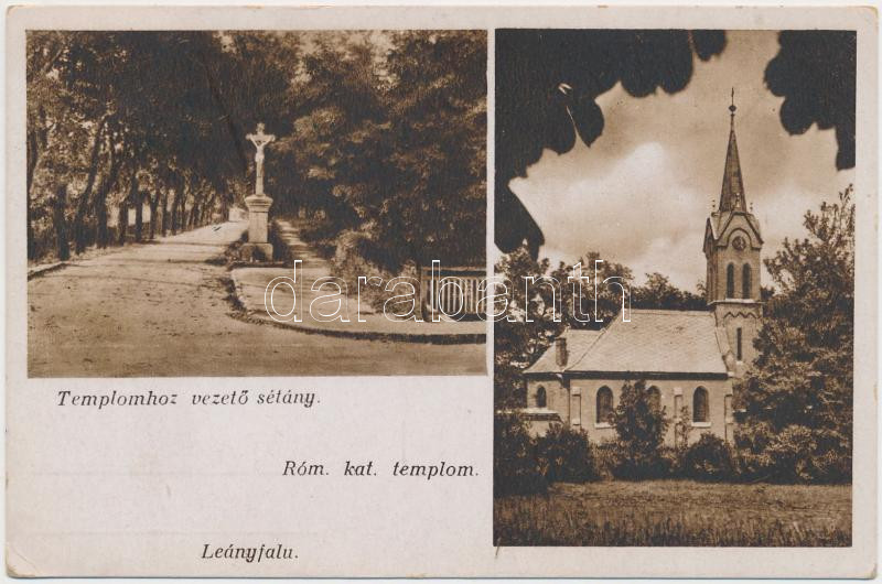 Beschreibung: Leányfalu, Római katolikus templom, templomhoz vezető sétány, Stampf Béla kiadása (EK)
