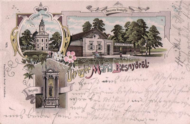 Beschreibung: Máriabesnyő, templom, kegykép, Neszveda Vendéglője, Neszveda Antal kiadása, Art Nouveau litho (EK)