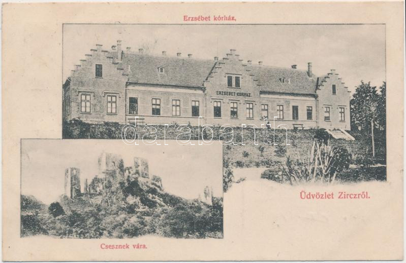 Zirc, Erzsébet kórház, Csesznek vár, kiadja Scherer János https://www.darabanth.com/de/213-Fernauktion/213.0/Ansichtskarten/Ungarn~400006/Zirc-Erzsebet-korhaz-Csesznek-var-kiadja-Scherer-Janos~II891185