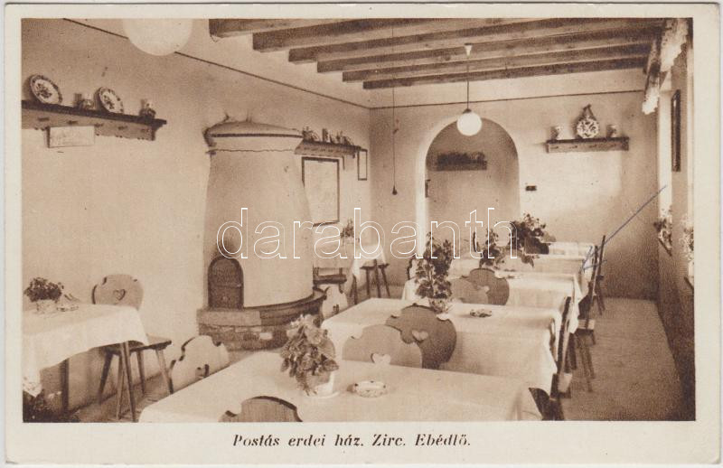 Zirc, Postás erdei ház, ebédlő, belső (EK) https://www.darabanth.com/de/213-Fernauktion/213.0/Ansichtskarten/Ungarn~400006/Zirc-Postas-erdei-haz-ebedlo-belso-EK~II890182