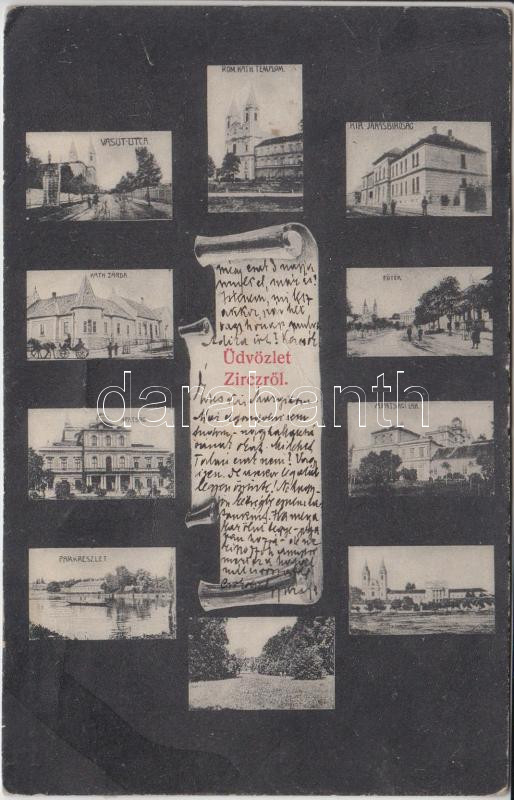 Beschreibung: Zirc, Vasút utca, Római katolikus templom, Járásbíróság, zárda, Apátság, Schehrer János kiadása (fa)
