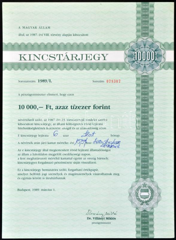 Budapest 1989. Kincstárjegy 10.000Ft-ról T:I https://www.darabanth.com/de/213-Fernauktion/213.0/Numismatik/Aktien-und-Tickets~200006/Budapest-1989-Kincstarjegy-10000Ft-rol-TI~II729545