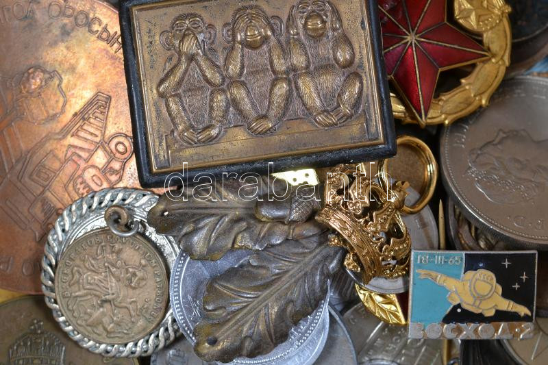 Kis doboznyi vegyes magyar és külföldi emlékérem, fémpénz, szocialista kitüntetés, jelvény, sportérem tétel jobb darabokkal, közte zománcozottak és tokosak is T:vegyes