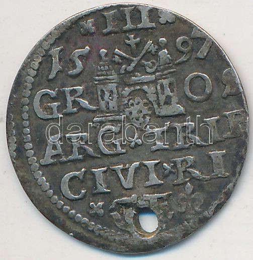 Poland / Riga 1597. 3 Grossi Ag "Sigismund III" (2.3g) C:VF hole