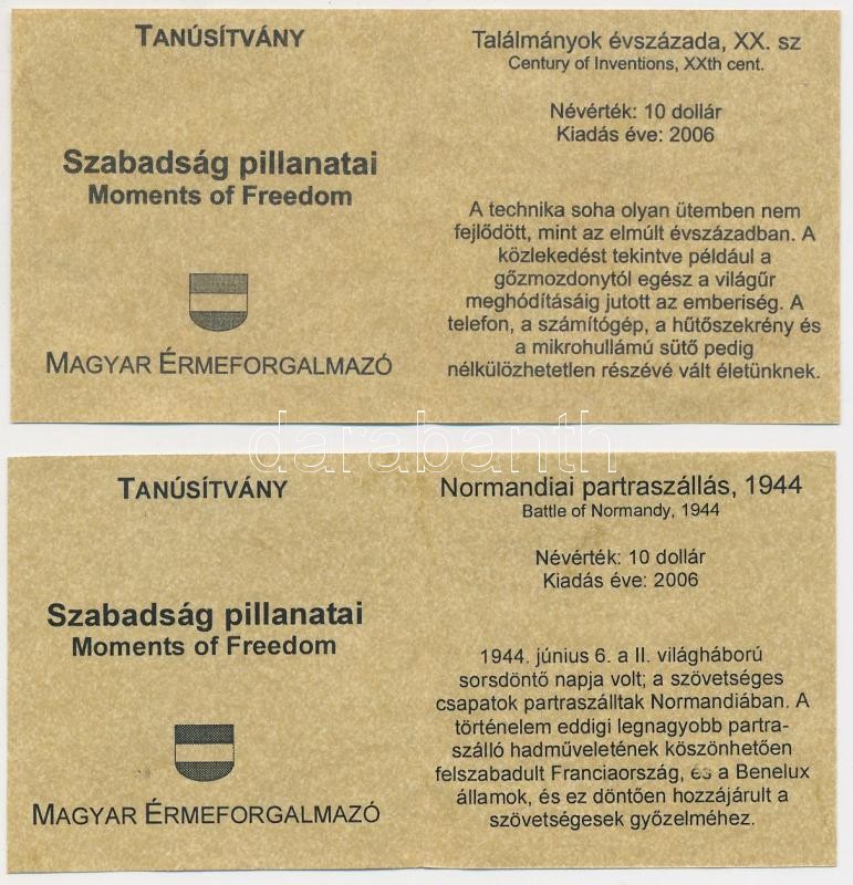Beschreibung: Libéria 2006. 10$ "Szabadság pillanatai" (2x) "Találmányok százada XX.sz." + "Normandiai partraszállás 1944.6.6." multicolor T:PP Tanúsítványokkal