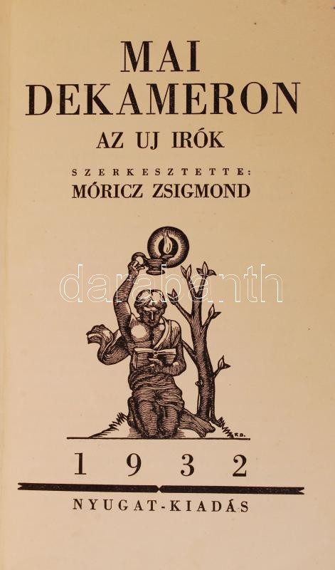Móricz Zsigmond(szerk.): Mai Dekameron, Az új írók. Bp., 1932, Nyugat. Újrakötött félvászon kötés, elején az eredeti címlappal, néhány lap foltos, egyébként jó állapotban.