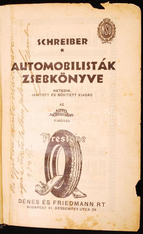 Schreiber József: Automobilisták zsebkönyve. hetedik kiadás. Bp. 1929. Auto- és motorujság kiad. 367 l. 47 l. (Budapest uccáinak és tereinek betürendes névsora.) Kissé megviselt illusztrált kiadói borítékban. Dedikált!