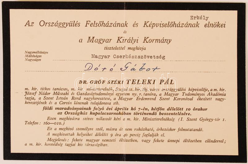 Beschreibung: 1941 Meghívó a Magyar Cserkésszövetség elnöke részére Teleki Pál miniszterelnök búcsúztatására