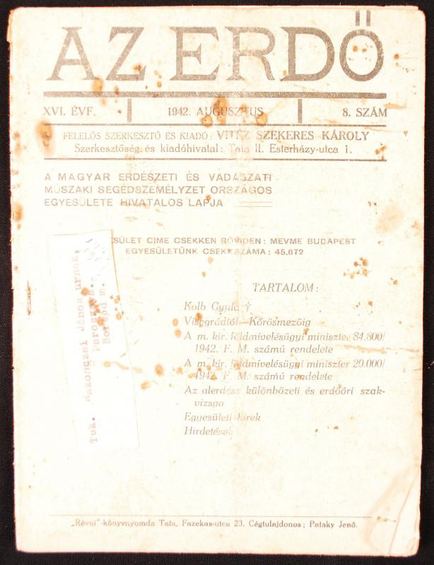 1942 Az Erdő A Magyar Erdészeti és Vadászati Műszaki Segédszemélyzet O... https://www.darabanth.com/de/214-Fernauktion/214.0/Andere-Sammelgebiete/Drucksachen~29/1942-Az-Erdo-A-Magyar-Erdeszeti-es-Vadaszati-Muszaki-Segedszemelyzet-Orszagos-Egyesulete-hi~II852569