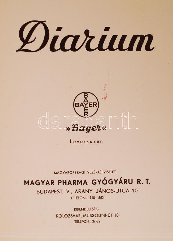 cca 1941 Bp., Diarium, a Bayer gyógyszerek katalógusa, 199p https://www.darabanth.com/de/214-Fernauktion/214.0/Andere-Sammelgebiete/Drucksachen~29/cca-1941-Bp-Diarium-a-Bayer-gyogyszerek-katalogusa-199p~II897343