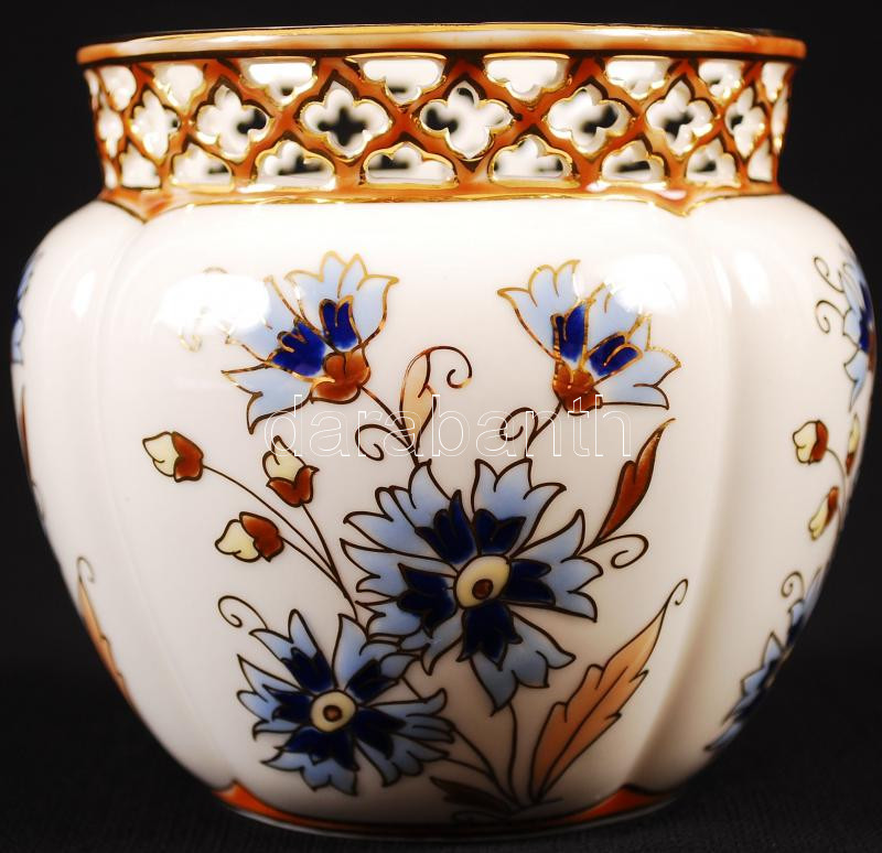 Zsolnay búzavirág mintás áttört kaspó, kézzel festett, hibátlan, jelze... https://www.darabanth.com/de/214-Fernauktion/214.0/Andere-Sammelgebiete/Porzellan~7/Zsolnay-buzavirag-mintas-attort-kaspo-kezzel-festett-hibatlan-jelzett-m-10-cm-d-9-cm-~II895600