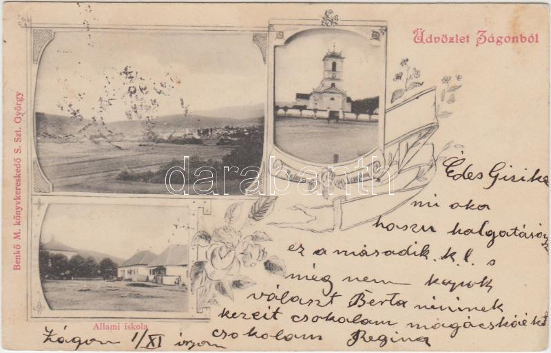 1899 Zágon, állami iskola, Református templom, kiadja Benkő M. / schoo... https://www.darabanth.com/de/214-Fernauktion/214.0/Ansichtskarten/Siebenburgen~200005/1899-Zagon-allami-iskola-Reformatus-templom-kiadja-Benko-M-school-church-Art-Nouveau-flo~II895262