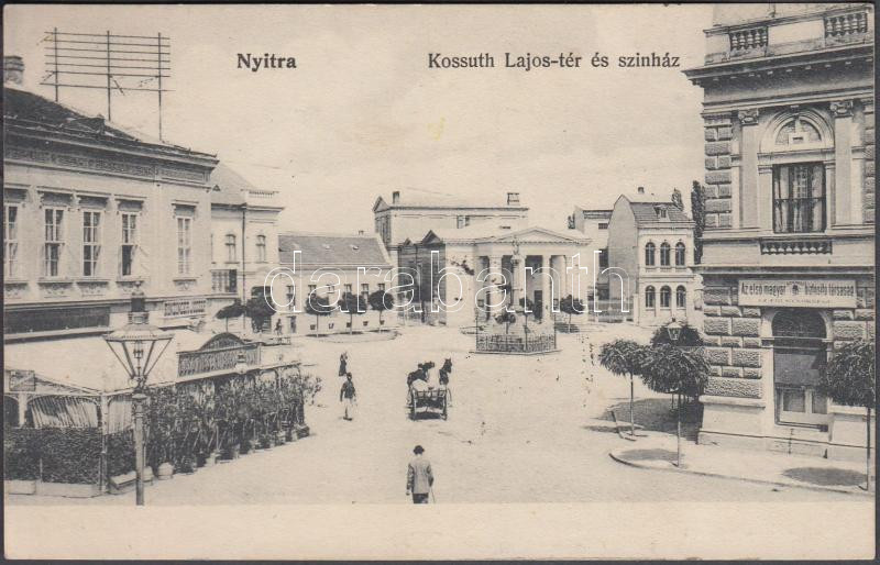 Nyitra, Kossuth Lajos tér, színház, Első Pilseni Sörcsarnok, Einzinger József üzlete, Első magyar biztosító társaság / square, theatre, beer hall, shop, insurance company
