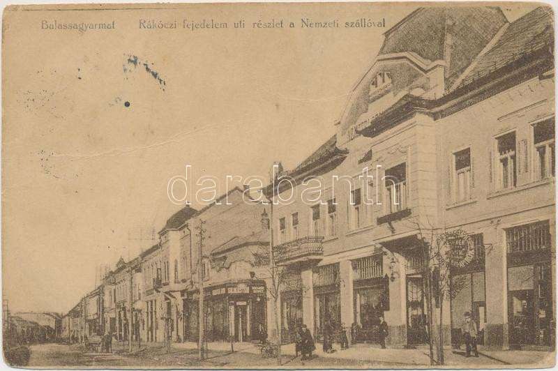 Beschreibung: Balassagyarmat, Rákóczi fejedelem út, Nemzeti Szálló, Silbersten úri és női divat, Hacker papírok (fa)