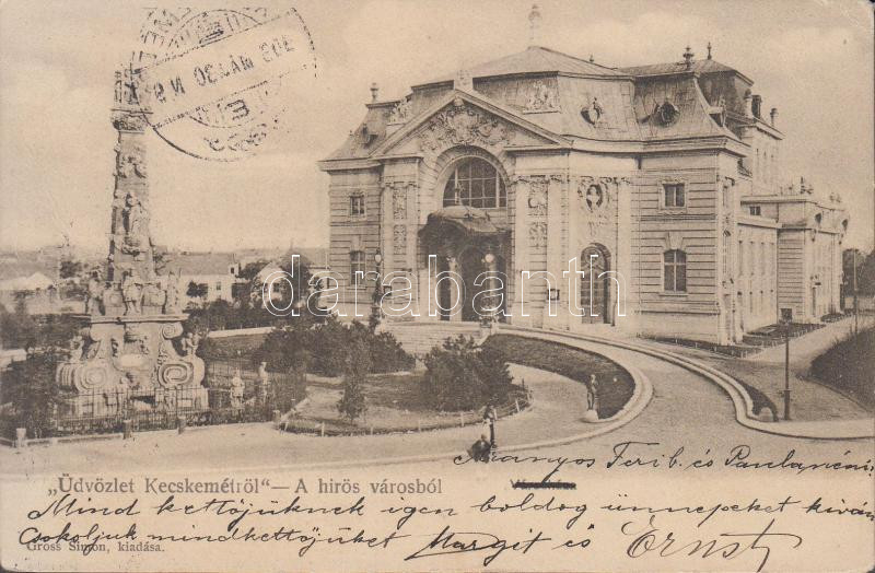 Kecskemét, Színház, Szentháromság szobor; Gross Simon kiadása (EK) https://www.darabanth.com/de/214-Fernauktion/214.0/Ansichtskarten/Ungarn~200004/Kecskemet-Szinhaz-Szentharomsag-szobor-Gross-Simon-kiadasa-EK~II896145