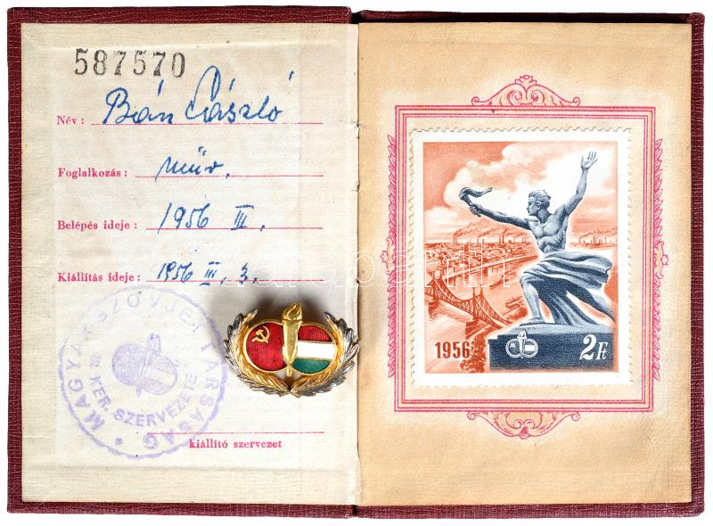 1956. "Magyar-Szovjet Társaság" aranyozott jelvénye és tagsági igazolv... https://www.darabanth.com/de/214-Fernauktion/214.0/Numismatik/Faleristik-Auszeichnungen-Medaillen-Ordnen~500016/1956-Magyar-Szovjet-Tarsasag-aranyozott-jelvenye-es-tagsagi-igazolvanya-T2~II896467