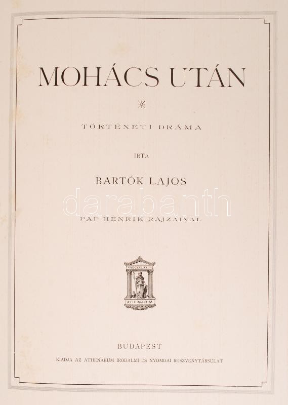 Bartók Lajos: Mohács után. Történeti dráma. Pap Henrik rajzaival. Bp., Athenaeum. Kiadói aranyozott, festett egészvászon kötés, aranyozott lapszélek, illusztrált, belül a lapok foltosak, kissé kopottas állapotban.