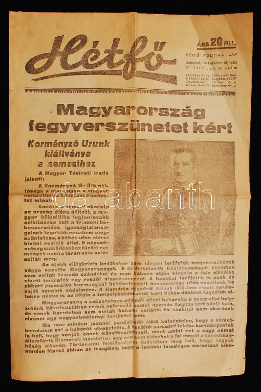 1944 A Hétfő című újság október 16-diki száma "Magyarország fegyverszü... https://www.darabanth.com/de/215-Fernauktion/215.0/Andere-Sammelgebiete/Drucksachen~12/1944-A-Hetfo-cimu-ujsag-oktober-16-diki-szama-Magyarorszag-fegyverszunetet-kert-cimmel~II902841