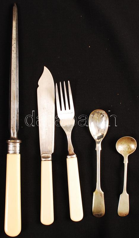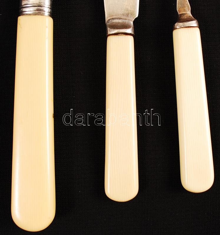 Beschreibung: Csontnyelű élező, jelzett, h: 29 cm, csontnyelű kés és villa, 2 db kiskanál