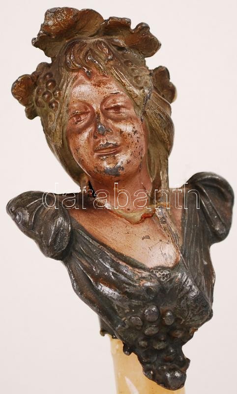 Beschreibung: Női büszt, festett fém, ragasztott alabástrom talapzattal, m:15 cm